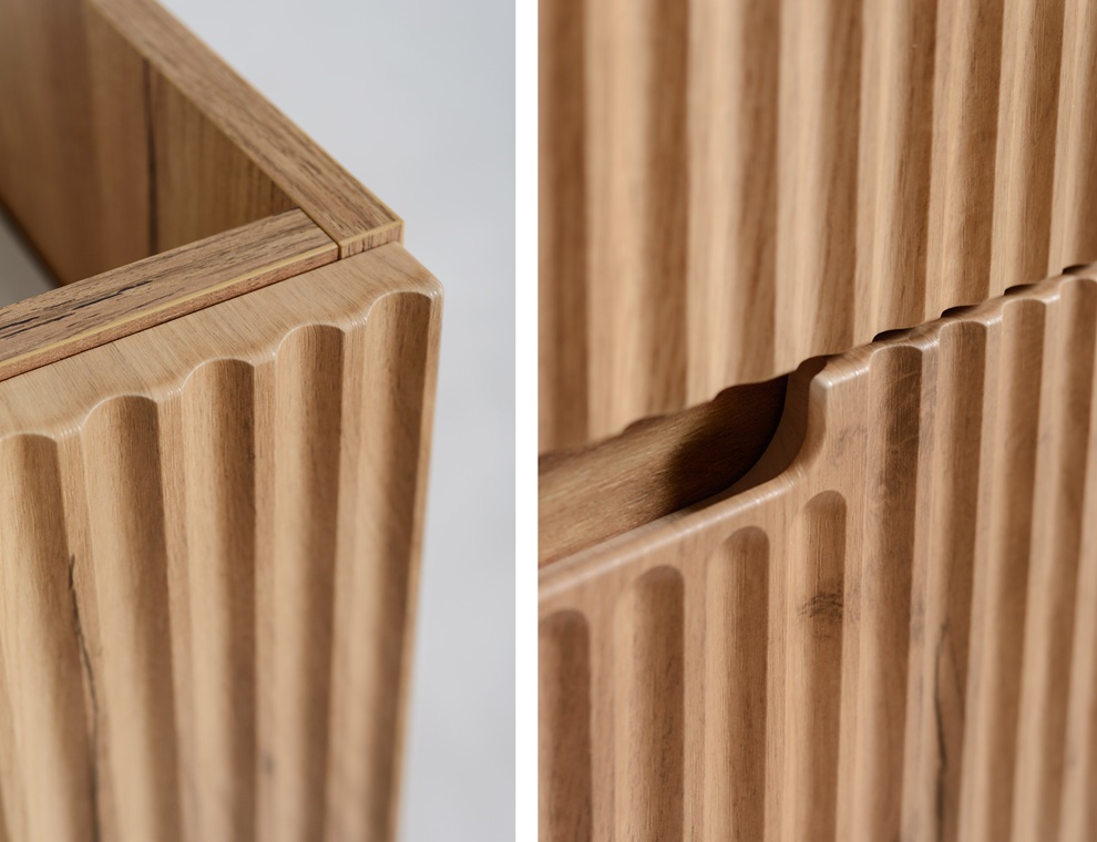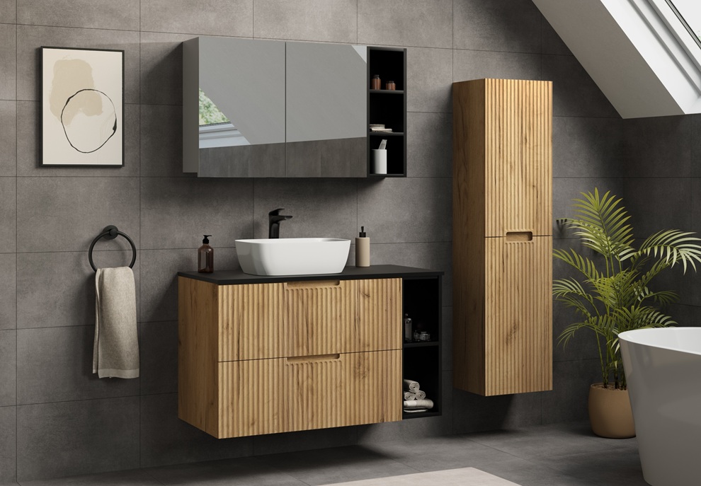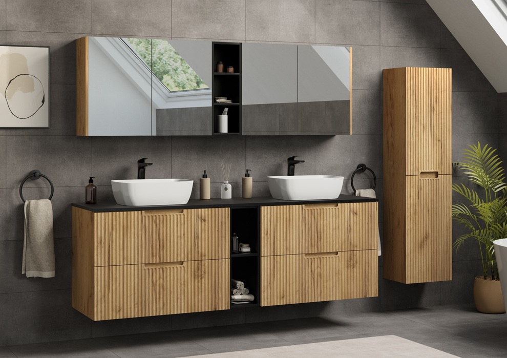 zdobené zvislým drážkovaním. Skrinky do kúpeľne sú závesné na stenu, v ponuke