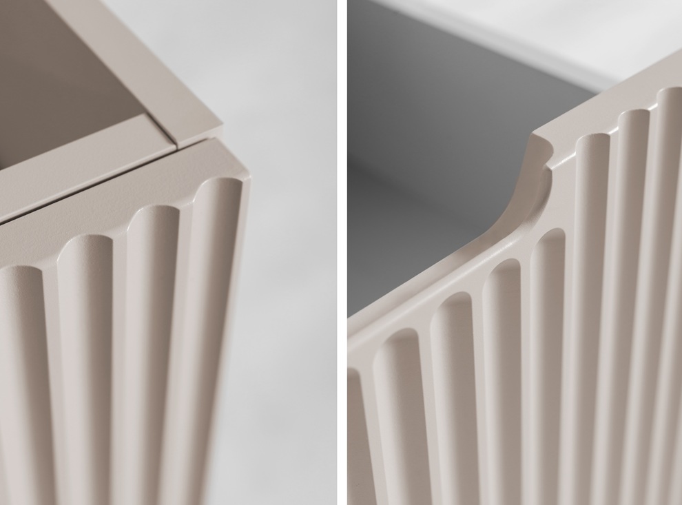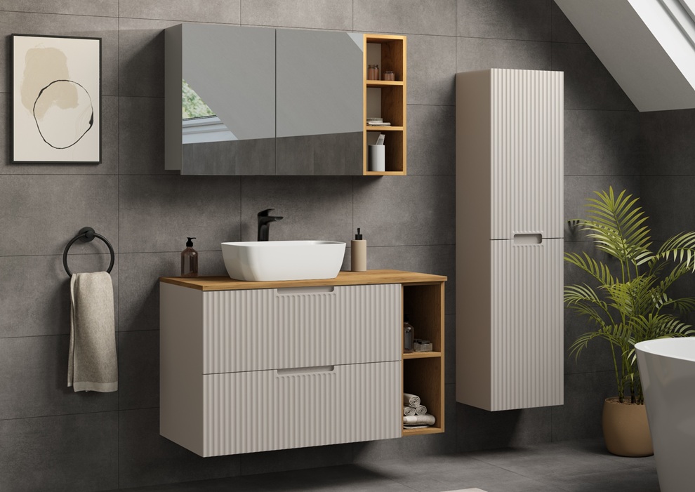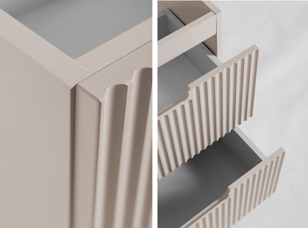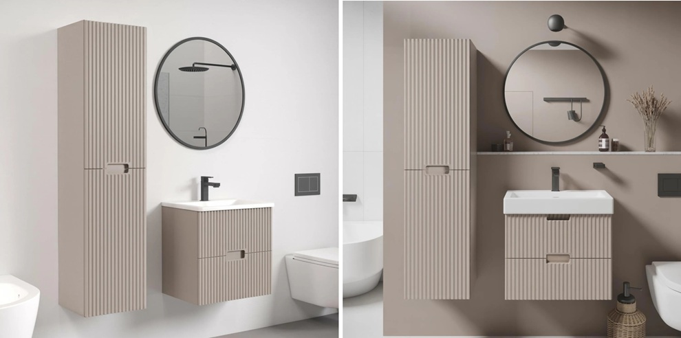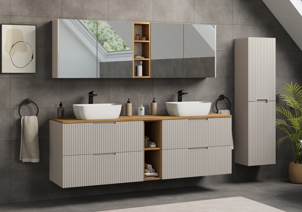 Kúpeľňový nábytok VENA kašmír je moderným riešením pre každého, kto hľadá estetické a praktické skrinky do kúpeľne. Kúpeľňové skrinky sú vyrobené z laminovanej drevotriesky s ABS hranami, pričom predné plochy z MDF materiálu sú zdobené zvislým drážkovaním, dodávajú elegantný vzhľad a zaručujú dlhú životnosť. Súčasťou tejto kolekcie sú skrinky pod umývadlo v šírke od 60 cm do 180 cm, vysoké aj závesné skrinky, všetky v obľúbenom béžovom prevedení kašmír. Praktické zafrézované úchytky sú navyše nielen dizajnovým, ale aj funkčným prvkom.