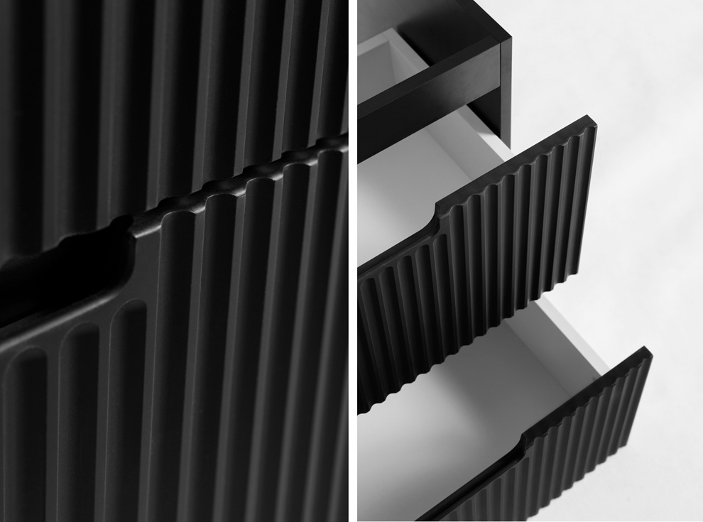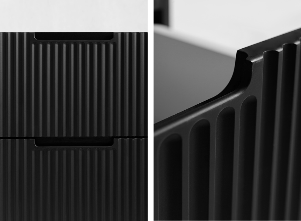 MDF dosky so zvislým dekoratívnym frézovaním. Čierne matné prevedenie pôsobí
