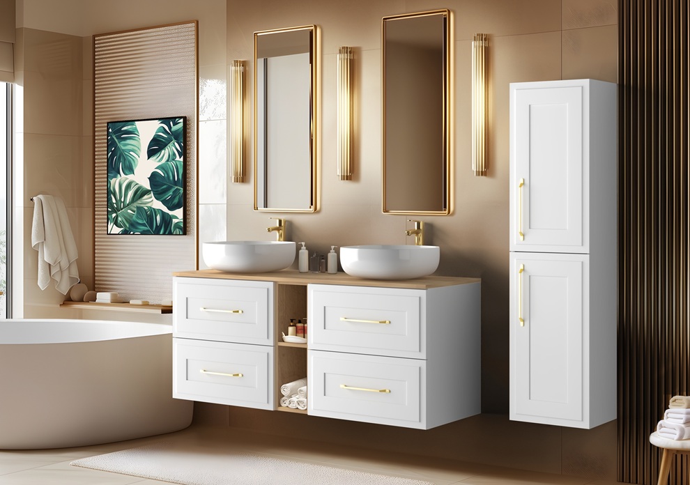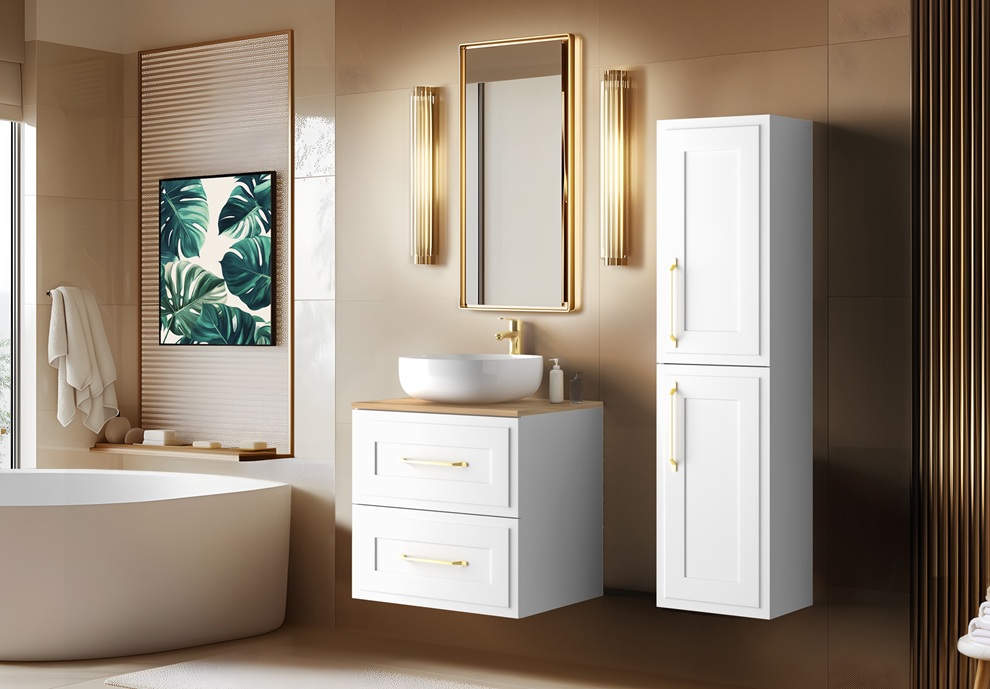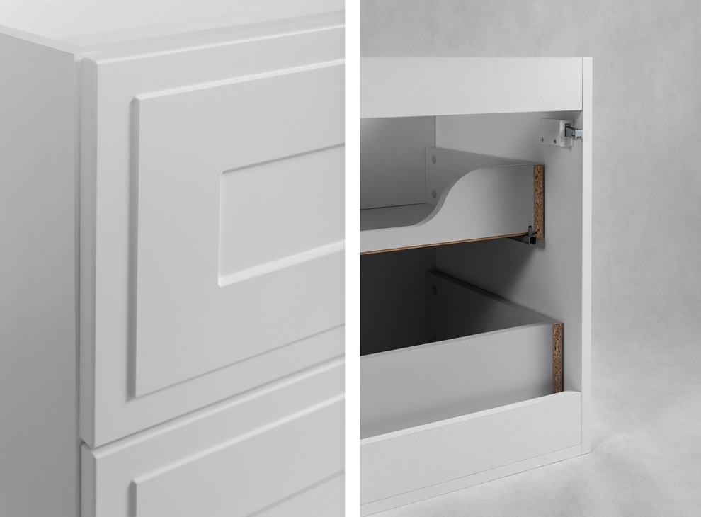 Nábytok do kúpeľne je vyrobený z laminovanej drevotriesky s ABS hranami, ktoré zvyšujú odolnosť voči vlhkosti. Predné plochy z MDF materiálu sú zdobené jemným frézovaním, ktoré podčiarkuje klasický charakter zostavy. Zásuvky aj dvierka sú vybavené funkciou tichého dovierania, čo zvyšuje komfort pri používaní. Súčasťou balenia sú úchytky v zlatej farbe. Skrinky do kúpeľne z kolekcie Classic poskytujú dostatok miesta na uloženie uterákov, kozmetiky, čistiacich prostriedkov či osobných potrieb.