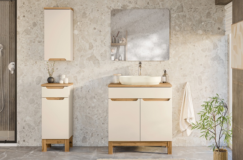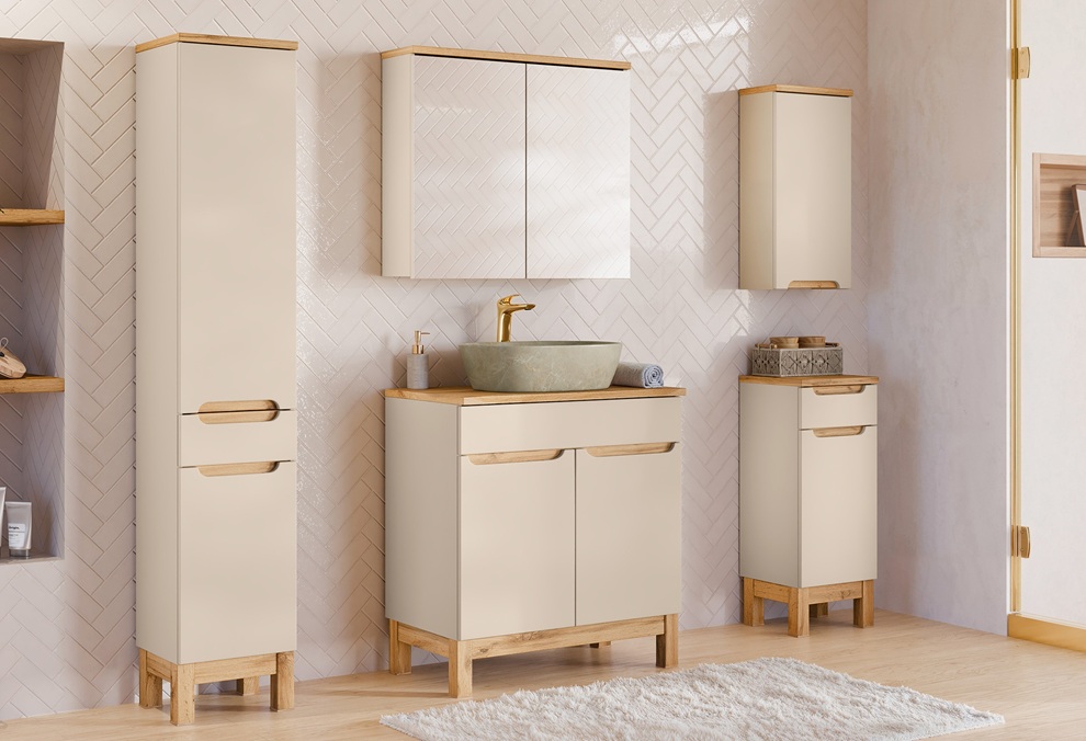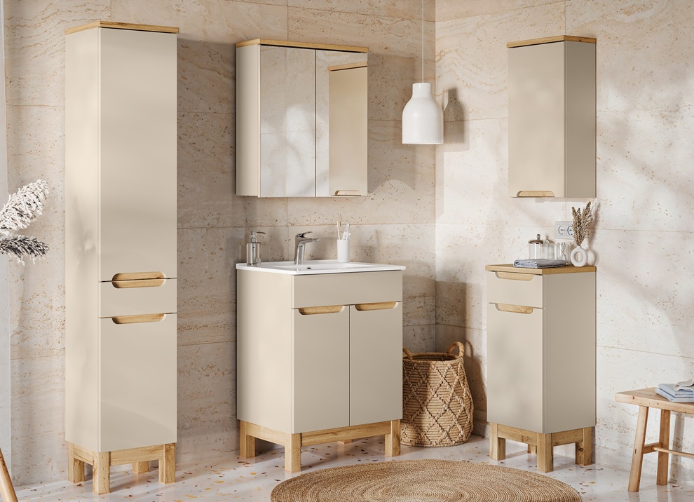Kolekcia kúpeľňového nábytku BALI Cashmere prináša moderné riešenie pre kúpeľňu, ktorá si zakladá na štýle aj funkčnosti. Korpusy sú vyrobené z laminovanej drevotriesky s ABS hranami, ktoré zabezpečujú dlhú životnosť a zvýšenú odolnosť voči vlhkosti. Dvierka z MDF materiálu majú hladký povrch, vďaka ktorému pôsobí nábytok elegantne a moderne. Zafrézované úchytky na dvierkach a zásuvkách podčiarkujú čistý, minimalistický vzhľad. V prevedení cashmere sa kolekcia ľahko prispôsobí akémukoľvek kúpeľňovému interiéru. Dolné skrinky stoja na nožičkách. Samozrejmosťou je tiché zatváranie, ktoré zvyšuje komfort pri každodennom používaní.