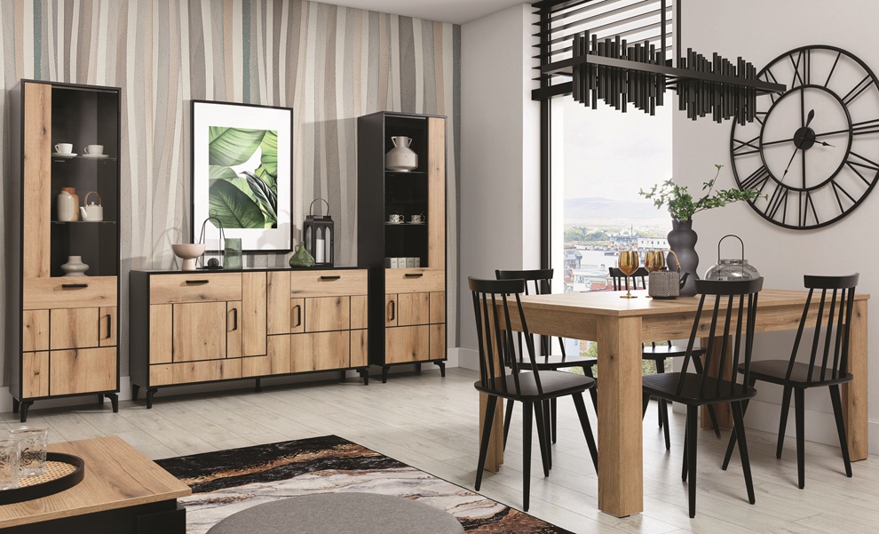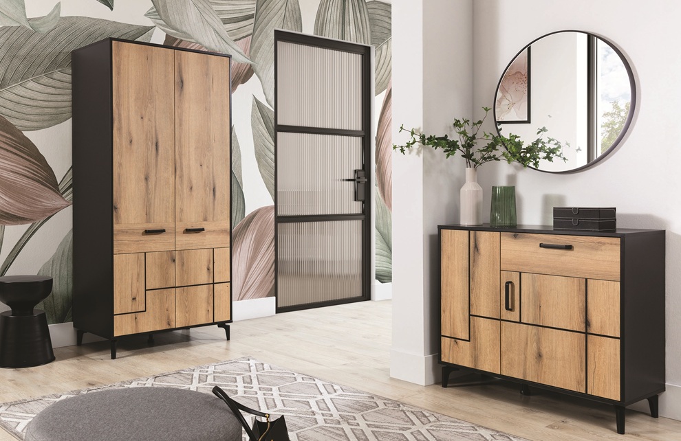 matná + dub evoke, ktoré dodáva interiéru útulnosť. Celkový charakter nábytku