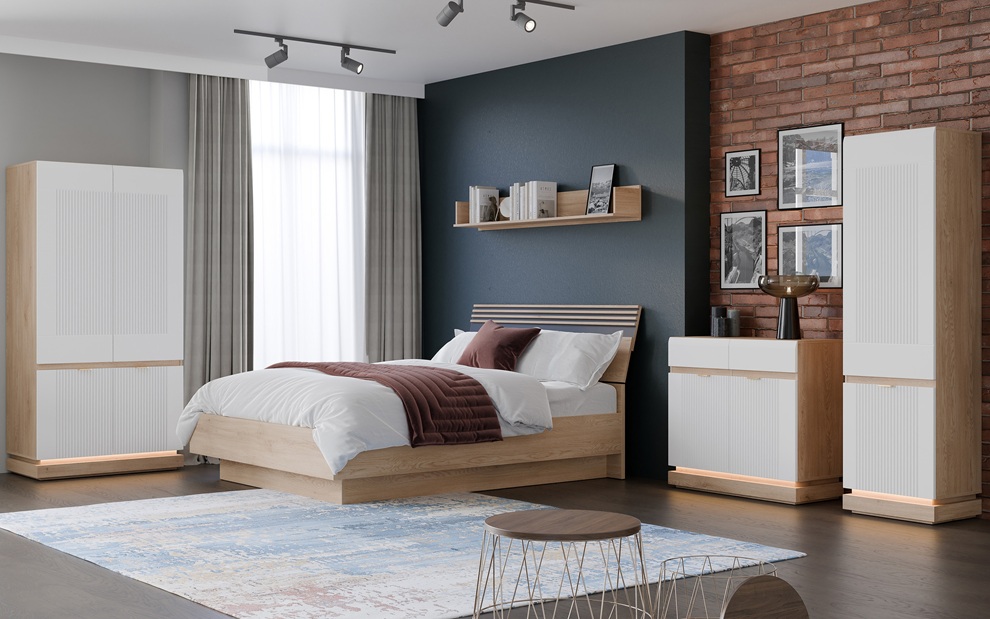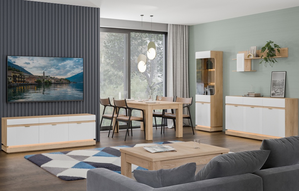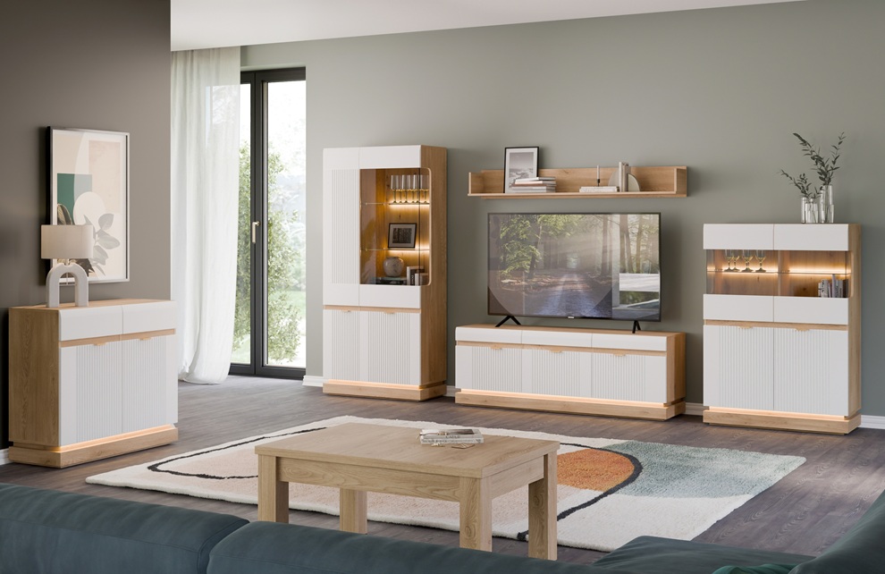 funkčnosti pre vašu obývačku, jedáleň či spálňu. Tento nábytok si vás získa elegantným kontrastom bielej matnej a prírodného odtieňa Dub Cremona