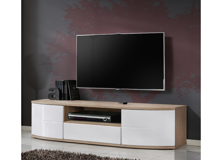 TV stolík ONTARIO I má dvoje oblé dvierka, zásuvku a otvorený priestor. Dvierka sa otvárajú systémom PUSH-CLICK. TV stolík je vhodný aj na širšie televízory.