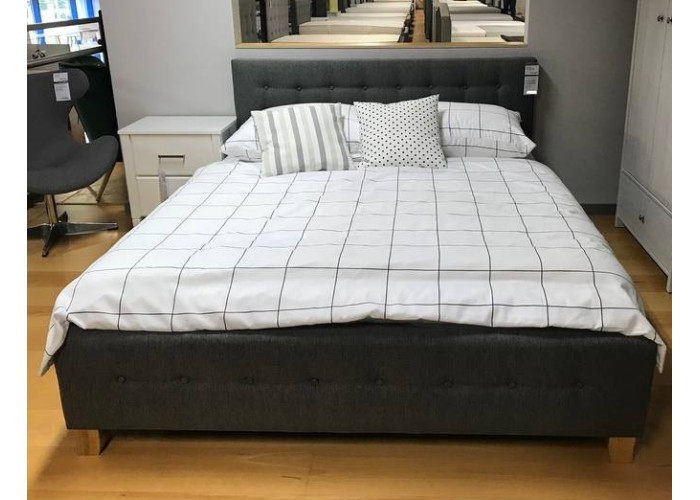 - Posteľ spočíva na nízkych nohách, ktoré boli vyrobené z dreva v prírodnej dubovej farbe.