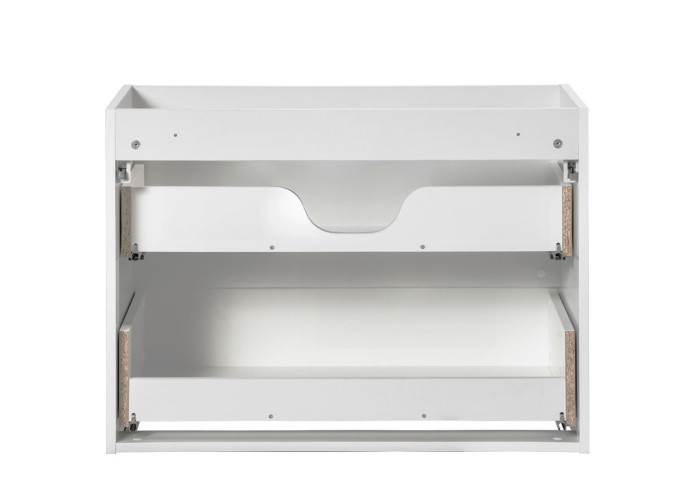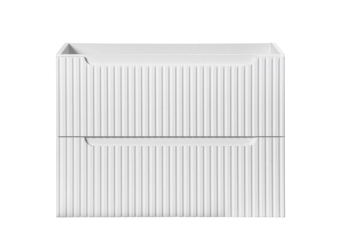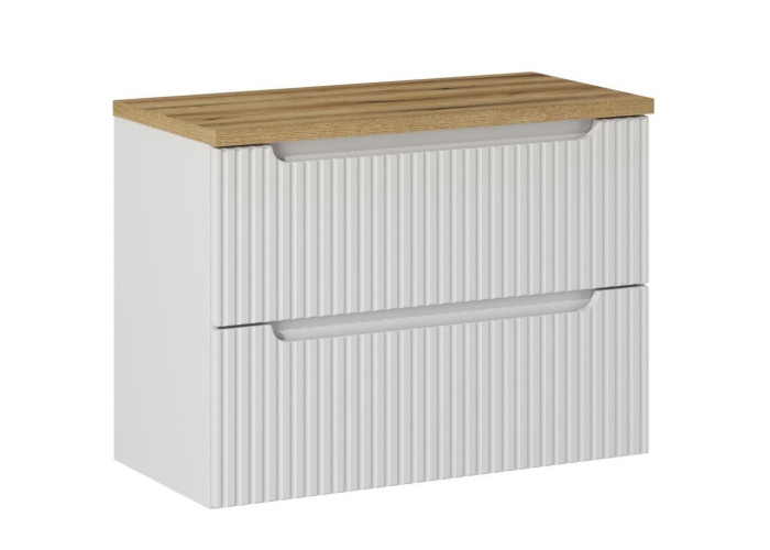 Predstavujeme Vám skrinku pod umývadlo s doskou NOVA WHITE 82-80-2S-DD, ktorá je súčasťou modernej kolekcie kúpeľňového nábytku navrhnutého s dôrazom na funkčnosť a moderný dizajn. Ide o praktickú zásuvkovú skrinku pod umývadlo v šírke 80 cm, ktorá poskytuje štedrý úložný priestor. Korpus skrinky je vyrobený z laminovanej drevotriesky s ABS hranami, čielka zásuviek sú z frézovaného MDF materiálu. Charakteristickým prvkom dizajnu sú predné plochy, ktoré sú elegantne zdobené jemnými zvislými pásikmi. Minimalistický vzhľad dotvárajú integrované úchytky.