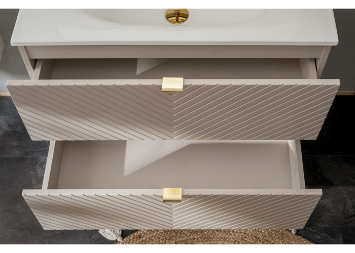 Praktickosť tejto kúpeľňovej skrinky podčiarkujú zásuvky vybavené funkciou tichého dovierania, ktoré zabezpečujú komfortné používanie. Súčasťou balenia sú tri sady úchytiek - lesklé zlaté, lesklé chrómové a čierne matné, čo vám dáva možnosť prispôsobiť vzhľad skrinky už pri montáži. Pre maximálne využitie priestoru hornej zásuvky odporúčame zakúpiť plochý sifón. Vrchné umývadlo nie je zahrnuté v cene, môžete si vybrať z našej širokej ponuky.