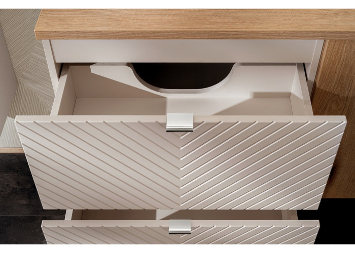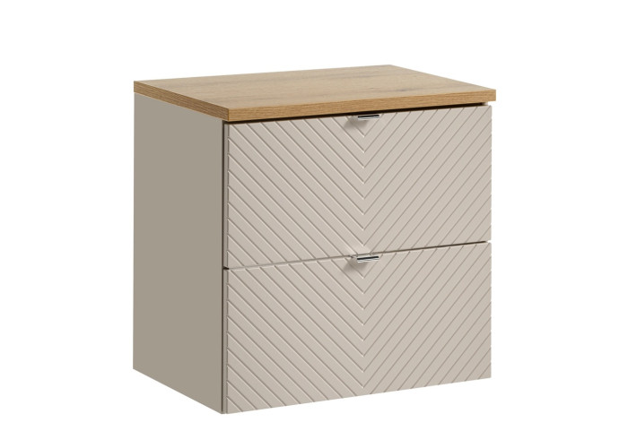 Skrinka pod umývadlo s doskou VIVA CASHMERE 82-60-2S-DD predstavuje ideálne riešenie pre tých, ktorí hľadajú kvalitný kúpeľňový nábytok v elegantnom prevedení. Béžová skrinka do kúpeľne so šírkou 60 cm je vyrobená z kvalitnej laminovanej drevotriesky s ABS hranami, pričom čielka zásuviek sú vyhotovené z MDF materiálu. Predné plochy sú zdobené modernými drážkami, ktoré dodávajú celému kusu originálny vzhľad. Skrinka vo farebnom prevedení kašmír (béžová) je určená na zavesenie na stenu, čím šetrí priestor a zároveň uľahčuje údržbu podlahy v kúpeľni. Vrchná doska je vo farbe dub evoke.