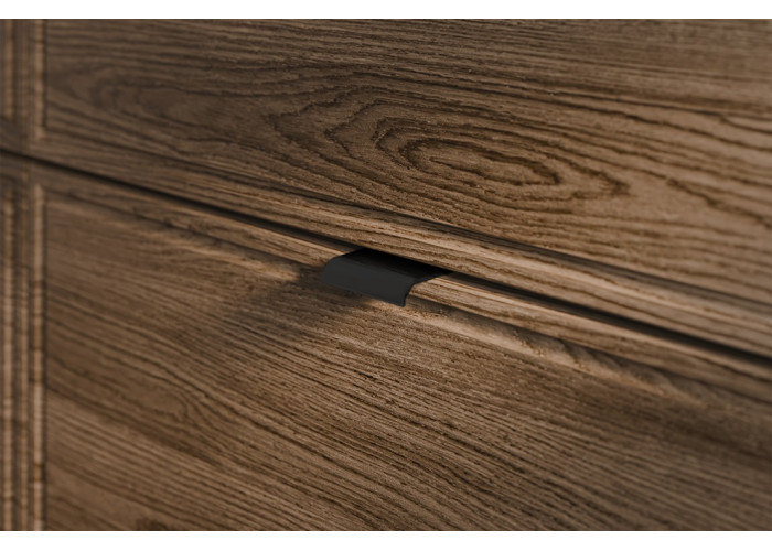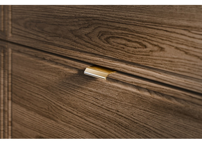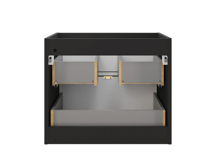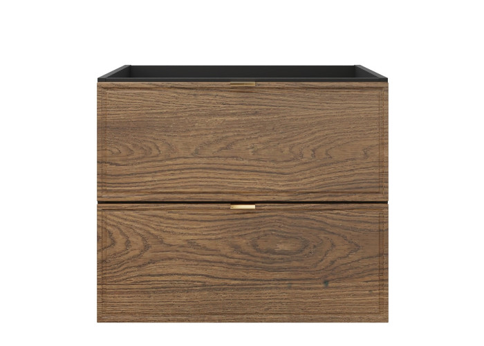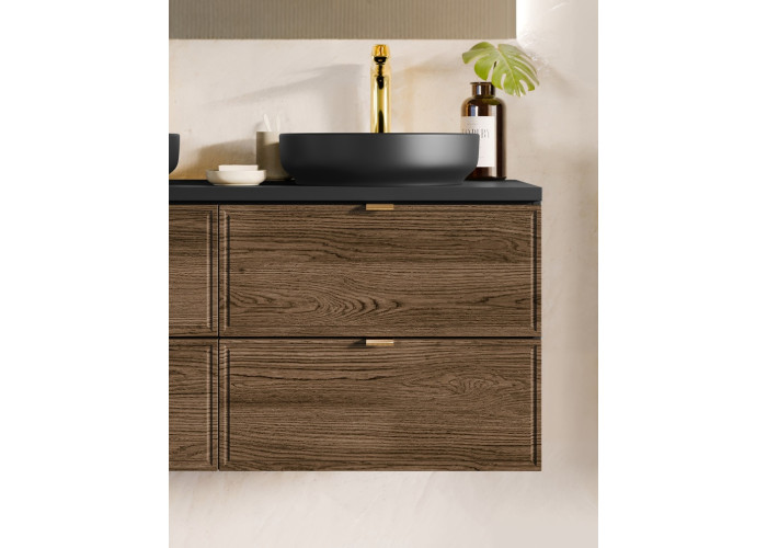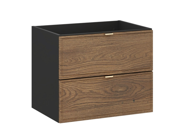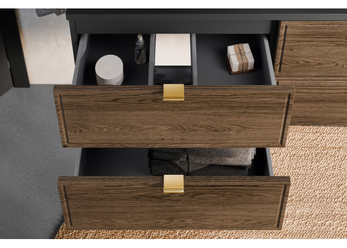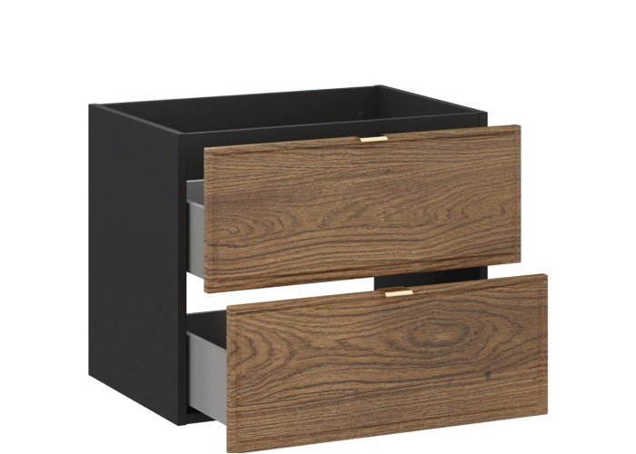 Kúpeľňová skrinka disponuje dvomi zásuvkami, ktorých predné plochy sú jednoducho zdobené a súčasťou sú tri farebné sady úchytiek – zlatá lesklá, chrómová lesklá a čierna matná. Obe zásuvky sú vybavené funkciou tichého dovierania. Vrchná zásuvka je delená, čo umožňuje namontovanie sifónu. Skrinka je dostupná vo farebnom prevedení dub Casella + čierna matná, čo jej dodáva elegantný a moderný vzhľad. Je určená na zavesenie na stenu.