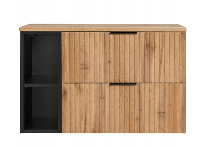 Skrinka pod umývadlo 100 cm ADEL predstavuje spoľahlivý kúpeľňový nábytok, ktorý je vhodný do všetkých konceptov kúpeľní. Kúpeľňová skrinka v šírke 100 cm sa skladá z 80 cm zásuvkovej skrinky, 20 cm otvoreného regálu v čiernej farbe a 100 cm vrchnej dosky. Je vyrobená z kvalitnej laminovanej drevotriesky s ABS hranami, čielka zásuviek z MDF materiálu odolnému voči vlhkosti. Farebné prevedenie dub wotan/čierna dodáva prirodzený vzhľad a vnútorné časti zásuviek sú v sivej farbe.