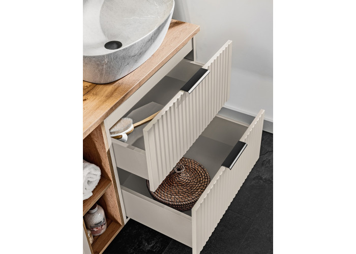 Hľadáte kvalitný a zároveň dizajnovo zaujímavý kúpeľňový nábytok? Skrinka pod umývadlo ADEL cashmere 82-60-2S predstavuje ideálnu voľbu pre tých, ktorí ocenia elegantné spracovanie a moderný vzhľad. Skrinka pod umývadlo v šírke 60 cm je navrhnutá tak, aby poskytla dostatok úložného priestoru a zároveň elegantne doplnila interiér Vašej kúpeľne. Korpus skrinky je vyrobený z kvalitnej laminovanej drevotriesky s ABS hranami, čo zaručuje jej dlhú životnosť aj vo vlhkom prostredí kúpeľne. Čielka zásuviek, zhotovené z MDF materiálu, zaujmú na prvý pohľad svojím zvislým ozdobným drážkovaním, ktoré dodáva skrinke jedinečný charakter. Celkový dojem podčiarkuje farebné prevedenie kašmír (béžová), ktoré pôsobí neutrálne a ľahko sa kombinuje s ostatnými prvkami.