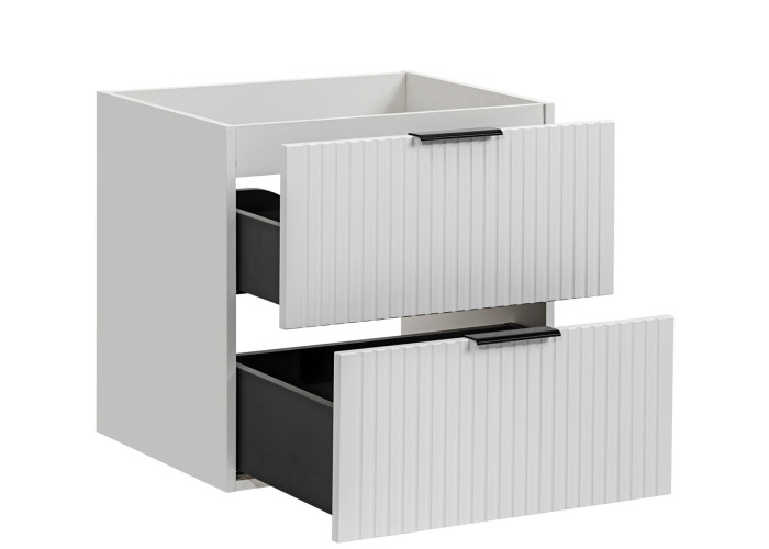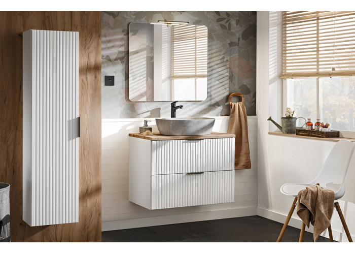 Biela skrinka pod umývadlo s vrchnou doskou ADEL white 82-60-2S-DV je praktickým riešením pre každú kúpeľňu. Tento kúpeľňový nábytok v šírke 60 cm poskytuje úložný priestor tam, kde je najviac potrebný - priamo pod umývadlom. Ide o závesnú skrinku, ktorá je vhodná na montáž na stenu a vďaka tomu zabezpečuje ľahké čistenie podlahy aj moderný, vzdušný dizajn kúpeľne. Skrinka je vyrobená z kvalitnej laminovanej drevotriesky s ABS hranami, čo jej dodáva pevnú konštrukciu a odolnosť voči vlhkosti. Čelá zásuviek sú z MDF materiálu a ich povrch má bielu matnú úpravu, ktorá sa jednoducho kombinuje s ďalšími prvkami kúpeľne. Špecifikom tejto série sú čielka zásuviek so zvislým ozdobným drážkovaním, vďaka čomu skrinka zapadne ako do moderných, tak aj do klasických kúpeľňových priestorov.