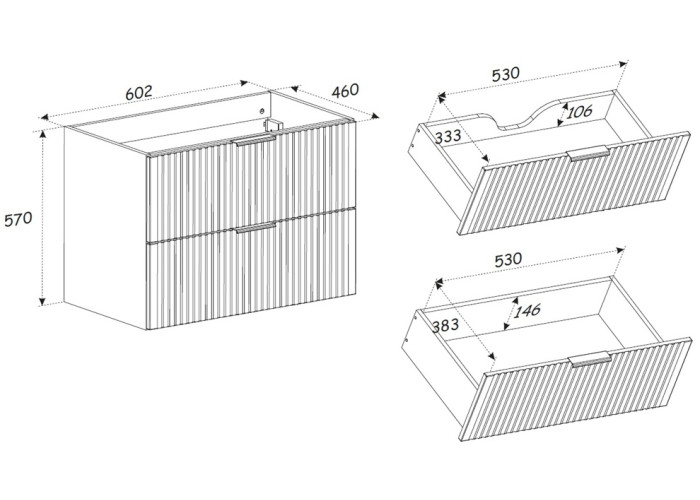 Súčasťou skrinky sú dve zásuvky vybavené mechanizmom tichého dovierania. Do zásuviek môžete komfortne uložiť kozmetiku, uteráky alebo čistiace prostriedky a mať všetko potrebné vždy po ruke. Pre maximálne využitie úložného priestoru odporúčame dokúpiť plochý sifón, ktorý neobmedzuje priestor v hornej zásuvke. Na výber máte tri farebné prevedenia úchytiek – čiernu matnú, lesklú zlatú a lesklú chrómovú. Úchytky si tak môžete jednoducho zladiť s batériou alebo ďalšími doplnkami vo Vašej kúpeľni. Vrchné umývadlo nie je súčasťou balenia.