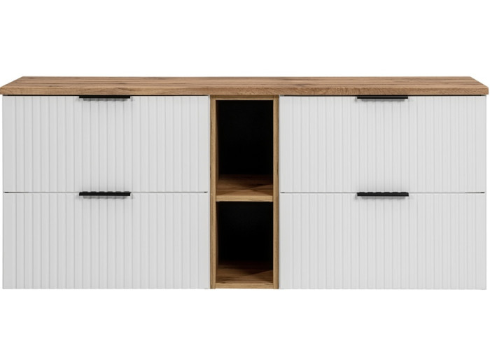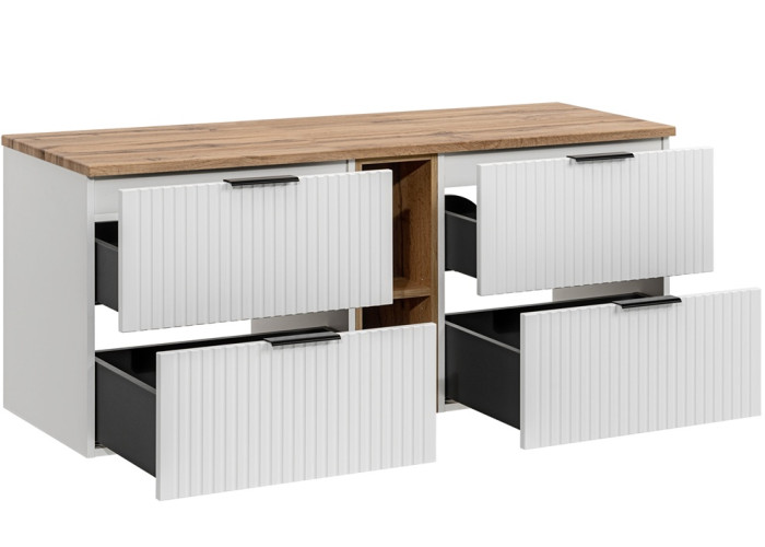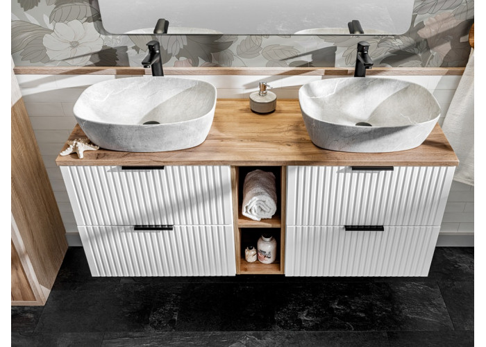 Štýlová skrinka pod umývadlo so šírkou 140 cm je dokonalou voľbou pre stredne veľké až veľké kúpeľne. Model ADEL white 82-140-DW spája súčasný dizajn s maximálnou funkčnosťou a poskytuje premyslené riešenie pre vašu kúpeľňu. Skladá sa: