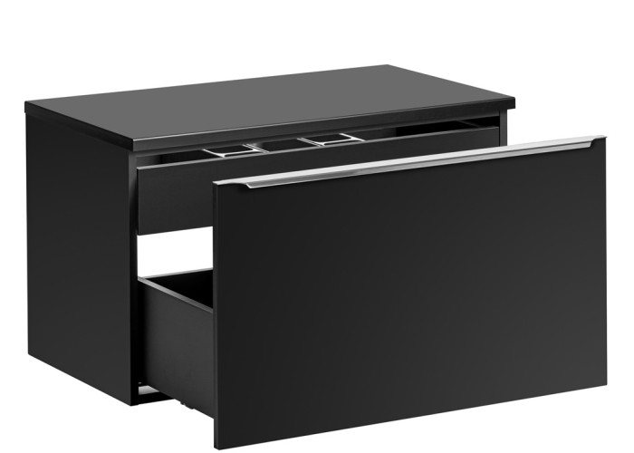 Vnútorné usporiadanie zahŕňa dve priestranné zásuvky, ktoré sú vybavené funkciou tichého dovierania. V hornej zásuvke sa nachádza praktický organizér, ktorý účinne zakrýva výrez na sifón a ponúka ďalší odkladací priestor, čo oceníte, ak sa rozhodnete skrinku využívať bez umývadla.