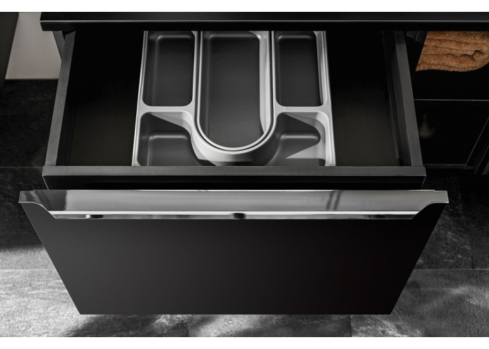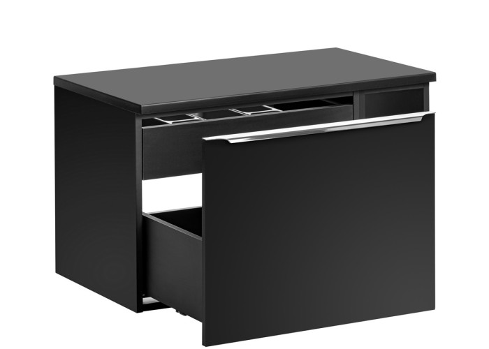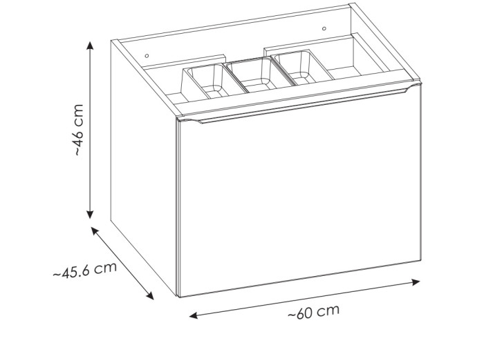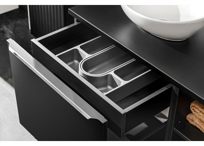 Skrinka je vyrobená z laminovanej drevotriesky s ABS hranami. Hladké predné plochy v kombinácii s chrómovou úchytkou a povrchovou úpravou v čiernej matnej farbe podčiarkujú moderný a štýlový vzhľad, ktorý zapadne do každého súčasného interiéru. Dve zásuvky skrinky sú vybavené funkciou tichého dovierania. Pre ešte efektívnejšie využitie úložného priestoru je horná zásuvka doplnená o praktický organizér. Tento organizér nielenže efektívne zakrýva výrez na sifón, ale ponúka aj ďalší využiteľný priestor na drobnosti. Túto funkciu oceníte najmä v prípade, že skrinku plánujete využívať bez umývadla.