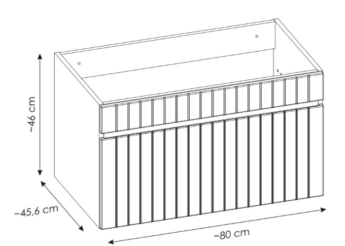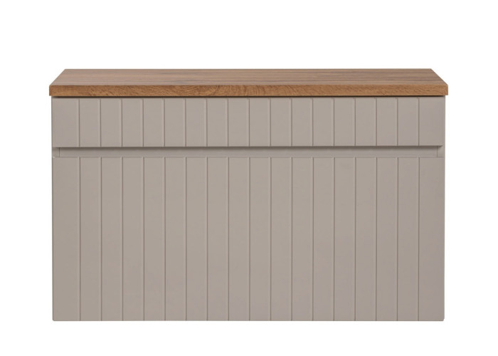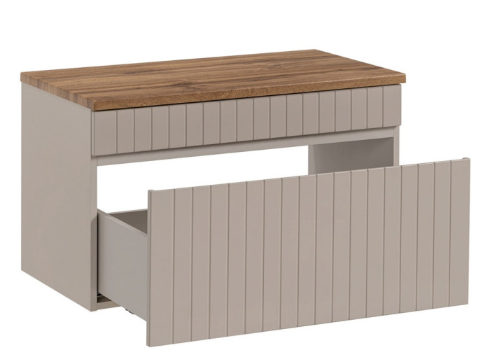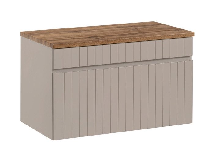 Skrinka pod umývadlo s doskou ICONIC Cashmere 82-80-D-1S-DE ponúka spojenie moderného dizajnu s praktickosťou, čo z nej robí ideálnu voľbu pre akúkoľvek kúpeľňu. Kúpeľňová skrinka v šírke 80 cm poskytuje dostatok úložného priestoru pre uloženie čistiacich prostriedkov, kozmetiky či iných kúpeľňových potrieb. Skrinka do kúpeľne je vyrobená z kvalitnej laminovanej drevotriesky s ABS hranami, pre lepšiu odolnosť proti vlhkosti. MDF čielko zásuvky je zdobené zvislými drážkami, ktoré dodávajú nábytku jemný estetický prvok. Minimalistická zafrézovaná úchytka umocňuje čistý a moderný vzhľad kúpeľňového nábytku.