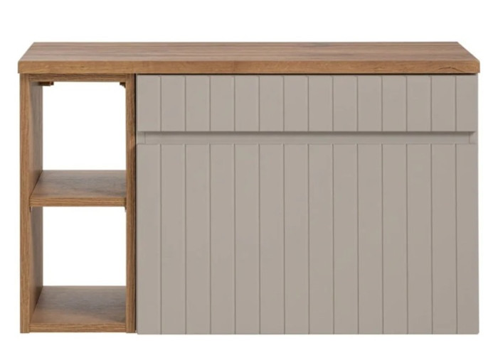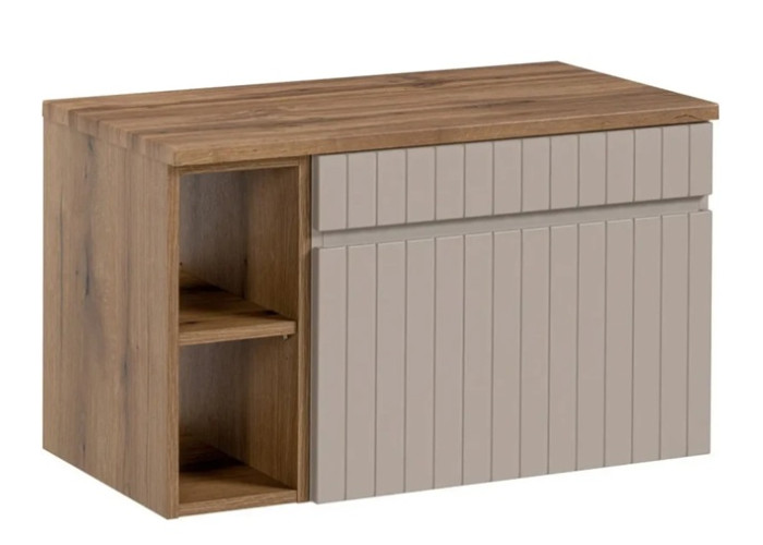 Skrinka do kúpeľne je vyrobená z kvalitnej laminovanej drevotriesky s ABS hranami, pre lepšiu odolnosť proti vlhkosti. MDF čielko zásuvky je zdobené zvislými drážkami, ktoré dodávajú nábytku jemný estetický prvok. Minimalistická zafrézovaná úchytka umocňuje čistý a moderný vzhľad kúpeľňového nábytku.