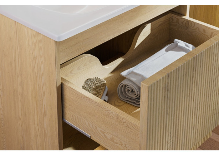 Skrinka pod umývadlo má šírku 60 cm a je závesná na stenu, umožňuje jednoduchú údržbu podlahy a dodáva kúpeľni vzdušnosť. Súčasťou sú dve praktické zásuvky s funkciou tichého zatvárania, ktoré zabezpečujú hladké a tiché používanie. Zafrézované úchytky umocňujú estetický dojem a jednoduchosť otvárania.