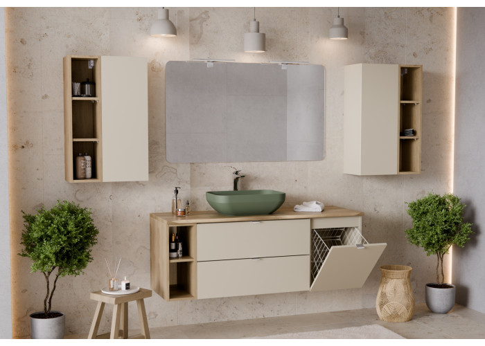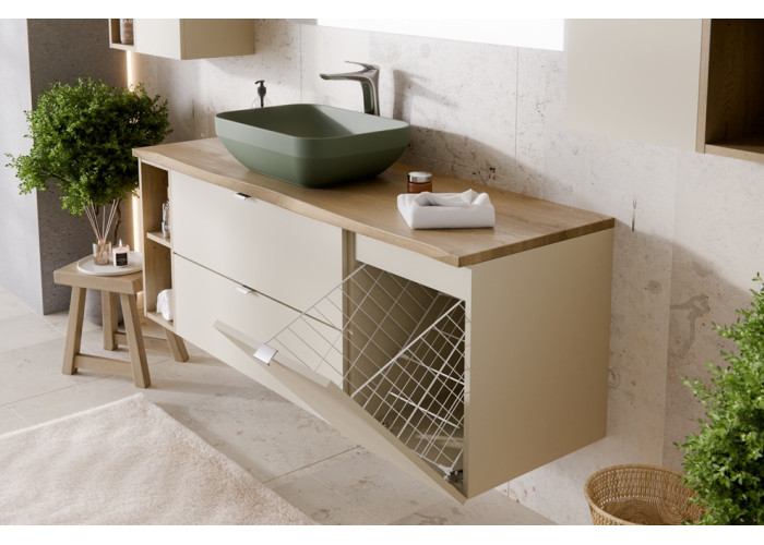 Balenie obsahuje tri varianty úchytiek: matnú čiernu, lesklú zlatú a lesklú chrómovú, vďaka čomu si môžete vzhľad skrinky prispôsobiť farbe batérie alebo iným kúpeľňovým doplnkom. Skrinka je navrhnutá na zavesenie na stenu, čo uľahčuje čistenie podlahy a zároveň vizuálne zväčšuje priestor kúpeľne. Jej hlavnou výhodou je integrovaný kôš na prádlo, ktorý diskrétne ukryje špinavú bielizeň. Vrchná doska nie je súčasťou balenia.