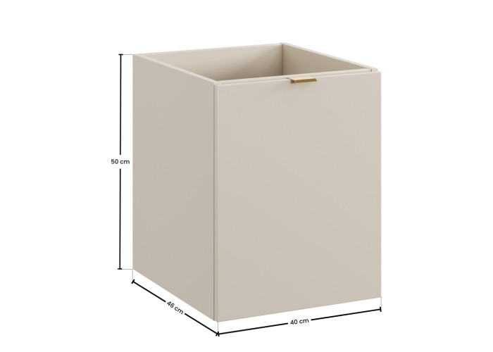 Skrinka s košom na bielizeň DALIA v odtieni cashmere je praktickým a zároveň štýlovým doplnkom do modernej kúpeľne. Kúpeľňová skrinka so šírkou 40 cm je určená na ukladanie bielizne a môžete ňou rozšíriť napr. skrinky pod umývadlo. Je vyrobená z kvalitnej laminovanej drevotriesky, doplnenej o ABS hrany, ktoré zvyšujú jej odolnosť voči vlhkosti aj mechanickému poškodeniu. Predné dvierka sú hladké, v minimalistickom štýle.
