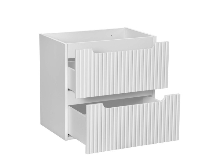 Skrinka je závesná na stenu, čo pôsobí moderne a zároveň umožňuje jednoduché udržiavanie poriadku v kúpeľni. Vyrobená je z laminovanej drevotriesky s ABS hranami, predné plochy sú z MDF materiálu. Farebné prevedenie je biela matná + dub evoke, ktoré sa ľahko kombinuje s ostatným nábytkom do kúpeľne. Zafrézované úchytky zachovávajú jednoduchý vzhľad a zásuvky vybavené funkciou tichého dovierania zabezpečujú komfortné a tiché používanie.