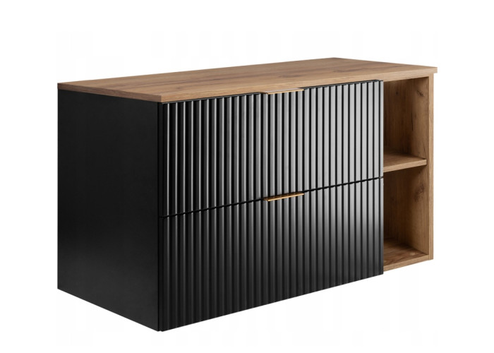 Skrinka pod umývadlo s vrchnou doskou FLOW B100DC vo farebnej kombinácii čierna matná/dub craft zlatý predstavuje ideálne riešenie pre moderné a funkčné vybavenie kúpeľne. Tento kvalitný kúpeľňový nábytok v šírke 100 cm pozostáva z troch častí: