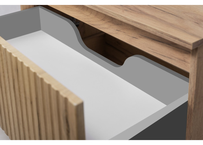 Korpus je vyrobený z laminovanej drevotriesky s ABS hranami, čielka zásuviek sú z MDF materiálu. Farebné prevedenie dub craft zlatý dodáva skrinke elegantný a luxusný nádych. Vnútorné časti zásuviek sú v neutrálnej svetlosivej farbe. Skrinka je určená na zavesenie na stenu, čo uľahčuje upratovanie podlahy a pôsobí odľahčeným dojmom. Súčasťou balenia sú dve sady úchytiek – v čiernej a zlatej farbe – môžete si tak vybrať variant, ktorý lepšie zapadne do Vášho konceptu kúpeľne. Moderne drážkované čielka zásuviek dotvárajú celkový dizajn a podčiarkujú moderný charakter skrinky.