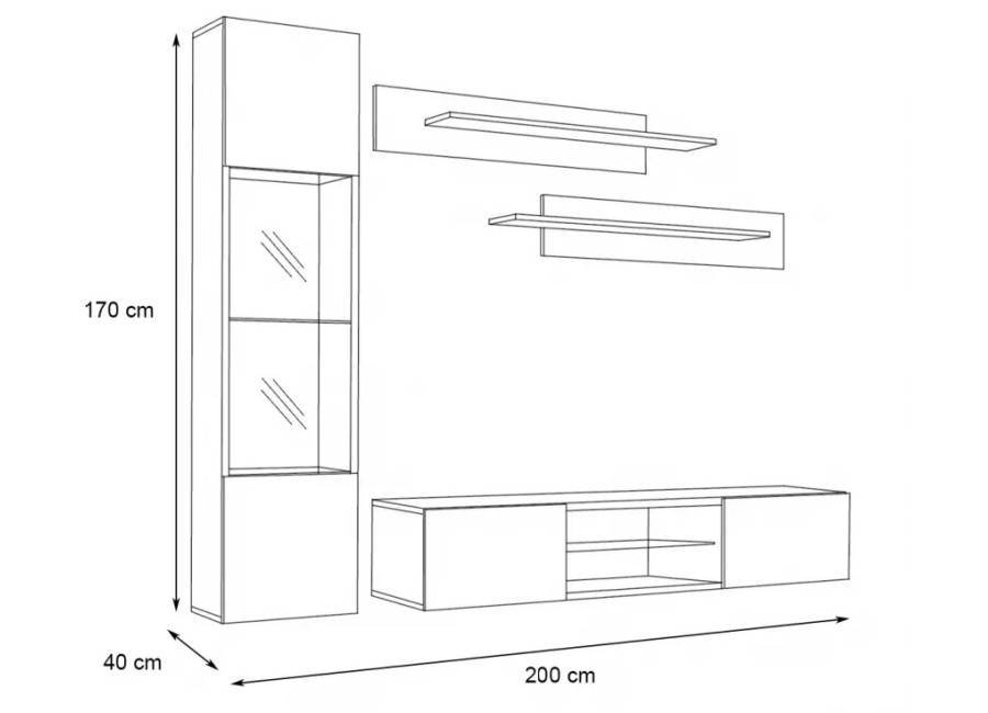 Obývacia stena FLY A4 sa skladá z niekoľkých častí: z 1 ks vysokej vitríny, 1 ks vysokej skrinky, 1 ks TV stolí..