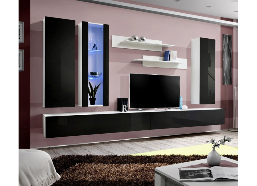 Obývacia stena FLY E4 sa skladá z niekoľkých častí: zo závesných skriniek a vitrín, 2 ks TV stolíkov a 2 ks závesných poličiek. Vhodná je najmä do moderne zariadených priestorov. Dvierka z vysokého lesku sa otvárajú pomocou bezúchytového systému PUSH-CLICK, kedy stačí jemne zatlačiť na dvierka, pre otvorenie a opätovné zatvorenie. Všetky skrinky je potrebné zavesiť na stenu, čo oceníte najmä pri upratovaní.