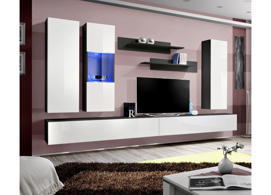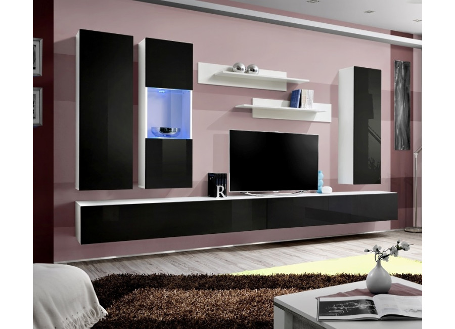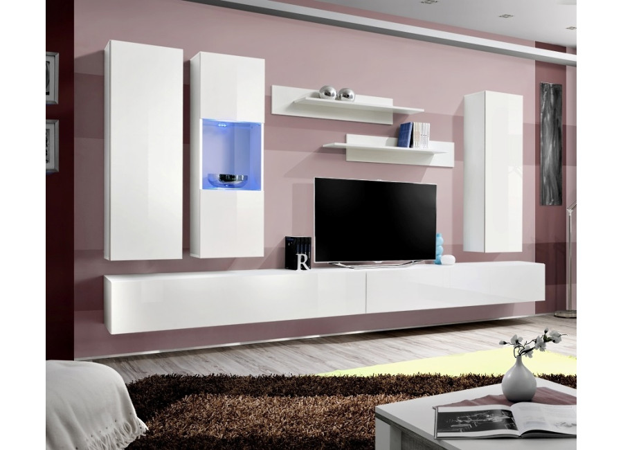 Obývacia stena FLY E5 sa skladá z niekoľkých častí: zo závesných skriniek a vitrín, 2 ks TV stolíkov a 2 ks závesných poličiek. Vhodná je najmä do moderne zariadených priestorov. Dvierka z vysokého lesku sa otvárajú pomocou bezúchytového systému PUSH-CLICK, kedy stačí jemne zatlačiť na dvierka, pre otvorenie a opätovné zatvorenie. Všetky skrinky je potrebné zavesiť na stenu, čo oceníte najmä pri upratovaní.
