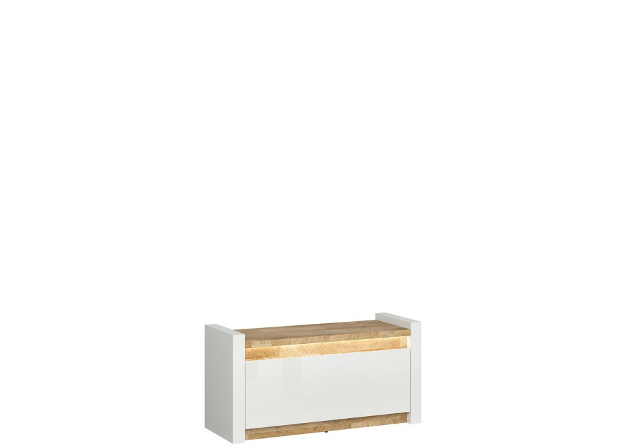 Nábytok ALAMEDA má moderný dizajn. Biela farba dvierok a korpusu je príjemne kombinovaná s doplnkami vo farbe a vzore dreva. Horná doska je podsvietená LEDkou.