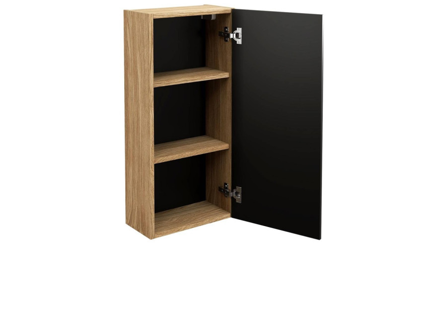 Elegantná a moderná závesná skrinka do kúpeľne LUXOR BLACK, ktorá prinesie do Vašej kúpeľne štýlový vzhľad a praktické riešenie pre úložný priestor. Táto skrinka je ideálnym doplnkom pre každú kúpeľňu, ktorá chce spojiť funkčnosť s moderným dizajnom. Korpus je vyrobený z laminovanej drevotriesky vo farbe dub olejovaný, čo zaručuje vysokú odolnosť voči vlhkosti. Dvierka sú vyrobené z MDF materiálu v čiernej matnej farbe, čo pridáva na jej elegantnom a luxusnom dojme.