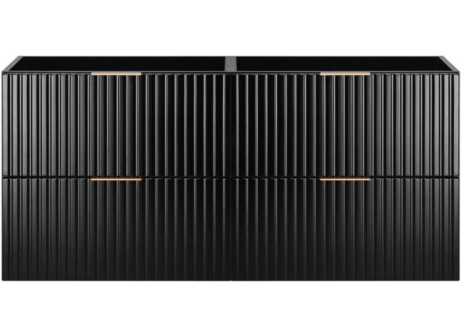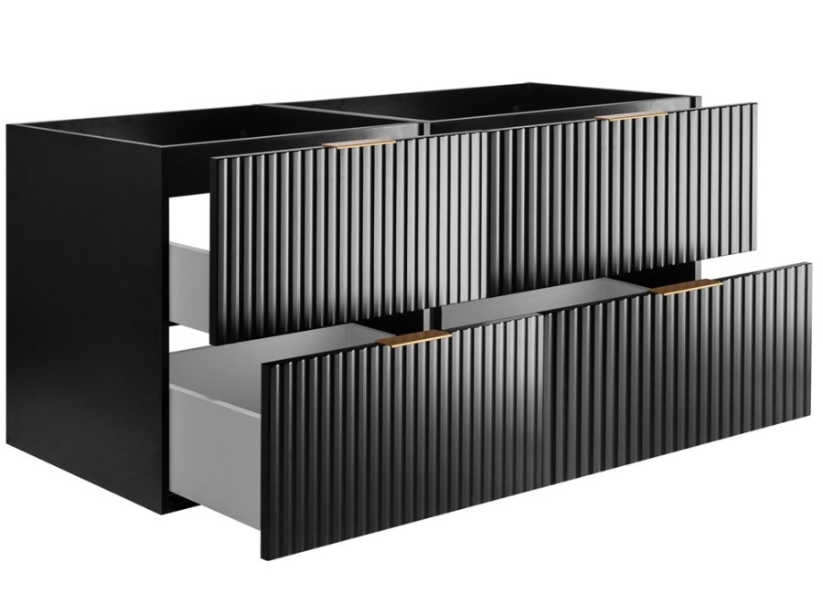 Závesná skrinka pod umývadlo FLOW B120 matnom čiernom prevedení je dokonalým riešením pre každého, kto túži po štýlovom a funkčnom kúpeľňovom nábytku. Tento elegantný kus nábytku sa hodí do rôznych kúpeľňových schém a jeho matný čierny povrch perfektne harmonizuje s rozličnými dizajnovými konceptmi. Skrinka má šírku 120 cm a je vytvorená zo spojenia dvoch samostatných skriniek s rozmerom 60 cm. Vyrobená je z laminovanej drevotriesky s hrúbkou 16 mm. Čielka zásuviek z MDF materiálu zaujmú najmä modernými drážkovanými detailmi. Zásuvky sú vybavené systémom Soft Close pre tiché a plynulé zatváranie.