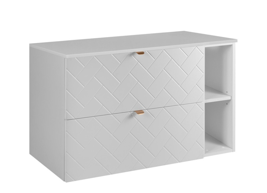 Vďaka modernému dizajnu s drážkovanými zásuvkami a matným bielym povrchom sa skrinka stane stredobodom Vašej kúpeľne. Kvalitné spracovanie z laminovanej drevotriesky (16 mm) a čielka z MDF materiálu zaručujú dlhú životnosť. Systém Soft Close zabezpečí príjemné a tiché zatváranie zásuviek. Súčasťou balenia sú tri sady dizajnových úchytiek (čierna, strieborná a zlatá), ktoré umožňujú prispôsobiť skrinku Vášmu osobnému vkusu. Elegantný kontrast vytvára svetlosivý interiér zásuviek, ktorý dopĺňa biely vonkajší povrch. Ku skrinke je potrebné zakúpiť plochý sifón a vrchné umývadlo.