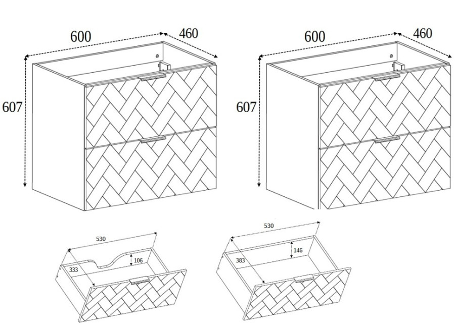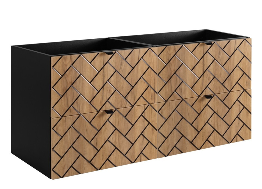 Túžite po kúpeľni, ktorá vyžaruje štýl a moderný dizajn? Objavte závesnú skrinku pod umývadlo TREND C120 vo farebnej kombinácii čierna a dub craft zlatý. So šírkou 120 cm, zloženou z dvoch elegantných modulov (2 x 60 cm), ponúka dostatok úložného priestoru pre všetky Vaše kúpeľňové potreby. Čisté línie, precízne spracovanie a kontrastná kombinácia čiernej a dubu craft zlatý dodajú kúpeľni nádych luxusu. Kvalitná laminovaná drevotrieska (16 mm) a MDF čelá zásuviek s moderným zdobením (vzor rybia kosť) zaručujú odolnosť voči vlhkosti. Pre maximálny komfort je skrinka vybavená systémom Soft Close pre tiché a plynulé dovieranie zásuviek. Súčasťou balenia sú dve sady úchytiek - čierna a strieborná - ktoré Vám umožnia dokonale zladiť skrinku s Vaším štýlom. Elegantný kontrast dotvára svetlosivý interiér zásuviek. Ku skrinke je potrebné zakúpiť plochý sifón a umývadlo.