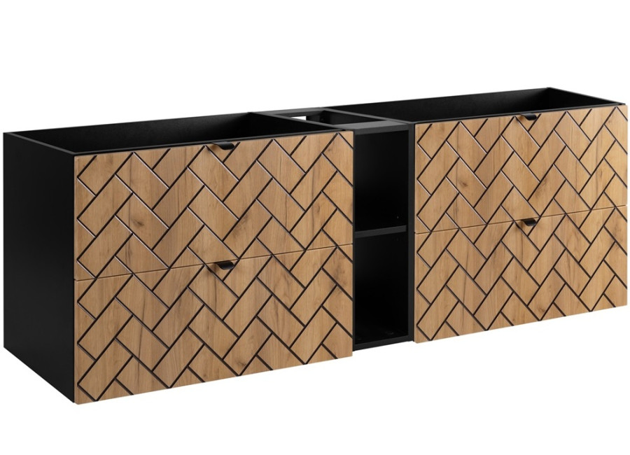 Objavte eleganciu závesnej skrinky pod umývadlo TREND C180 so šírkou 180 cm vo farebnej kombinácii čierna a dub craft zlatý. Dva 80 cm zásuvkové moduly a praktický 20 cm regál poskytujú veľkorysý priestor pre všetky Vaše kúpeľňové potreby. Čisté línie a moderne zdobené zásuvky so vzorom rybia kosť, dodajú kúpeľni nádych luxusu. Kvalitná 16 mm laminovaná drevotrieska s MDF čelami zásuviek zaručuje nielen estetický vzhľad, ale aj dlhú životnosť skrinky. Pre maximálny komfort je vybavená systémom Soft Close pre tiché a plynulé dovieranie.