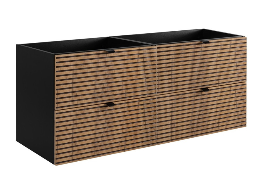 Skrinka je vyrobená z laminovanej drevotriesky v hrúbke 16 mm, čielka zásuviek sú z MDF materiálu. Vodorovné drážky na zásuvkách dodávajú skrinke moderný vzhľad a zaisťujú jednoduchú manipuláciu. Navyše, systém Soft Close zabezpečuje tiché a plynulé zatváranie zásuviek, čím zvyšuje komfort používania. Praktické detaily, ako sú dve úchytky v čiernej a striebornej farbe, ktoré sú súčasťou balenia a umožňujú Vám prispôsobiť si vzhľad skrinky podľa vlastného vkusu už pri montáži. Ku skrinke odporúčame zakúpiť aj vrchnú dosku a vrchné umývadlo alebo zápustné dvojumývadlo.