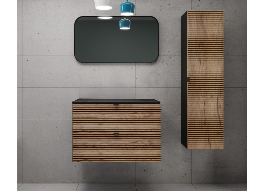 Centrálnym prvkom tejto zostavy je závesná skrinka pod umývadlo LOFT C80, s dvoma priestrannými zásuvkami vybavenými systémom Soft Close. Tento moderný mechanizmus zabezpečuje plynulé a tiché zatváranie zásuviek, čo výrazne zvyšuje komfort každodenného používania. Skrinka vo farbe dub craft zlatý, zdobená čiernymi pásikmi, vytvára elegantný glamour vzhľad, ktorý pozdvihne úroveň každej kúpeľne. Vyrobená z kvalitnej laminovanej drevotriesky s hrúbkou 16 mm, pričom čelné plochy zásuviek sú z MDF materiálu a ozdobené štýlovými horizontálnymi drážkami.