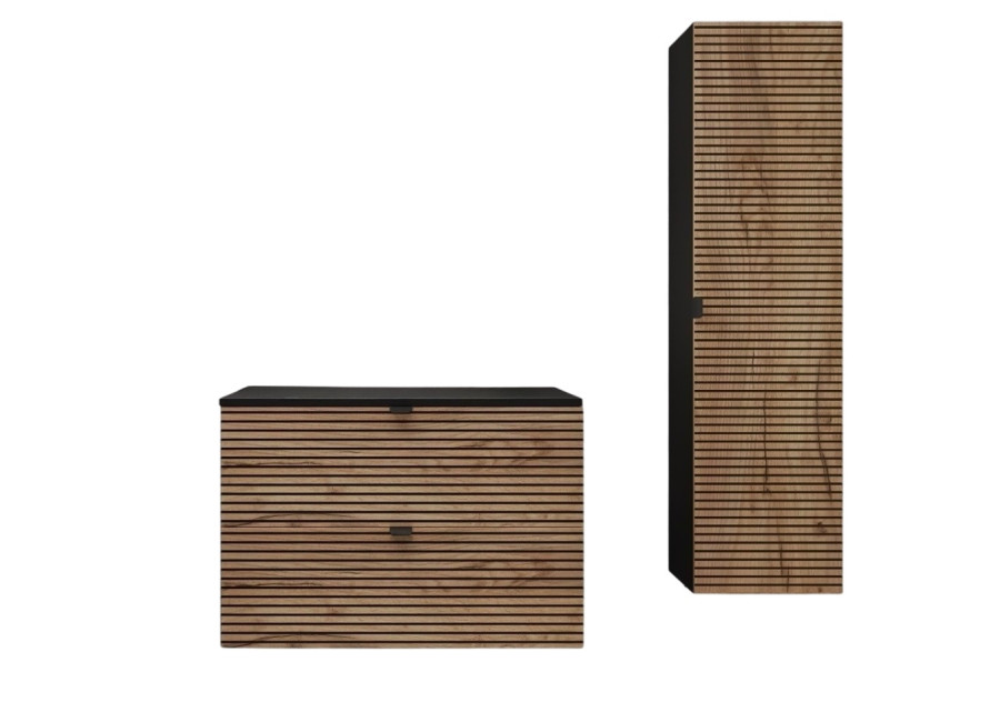 Dodatočný úložný priestor poskytuje vysoká policová skrinka so šírkou 35 cm, ktoré poskytuje dostatok miesta na všetky kúpeľňové potreby a drobnosti. Všetky časti zostavy sú závesné, čo nielenže vizuálne zväčšuje priestor, ale tiež uľahčuje upratovanie podlahy pod nábytkom.