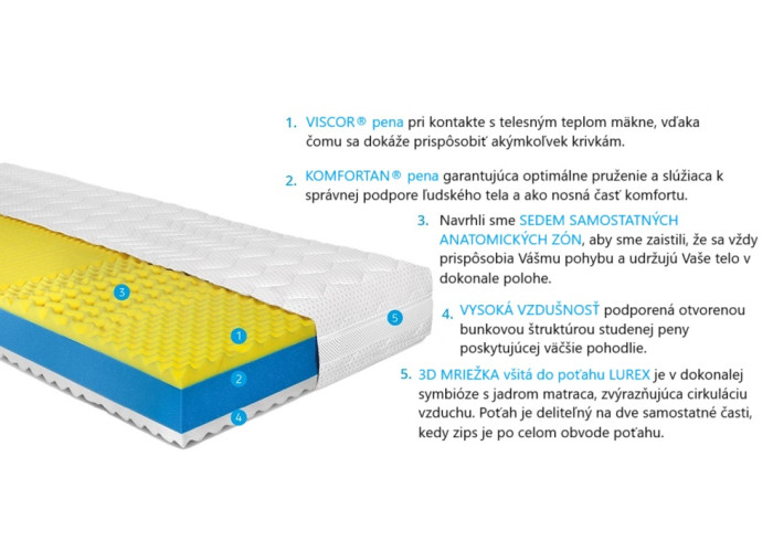 - 7-zónové profilovanie pre lepšie prekrvenie pokožky a uvoľnenie chrbtice počas spánku,