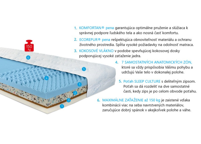 Vďaka unikátnej kombinácii flexibilných pien a kokosovej dosky je matrac KAREN pevný a pohodlný zároveň. Kokosová doska zlepšuje tuhosť a zvyšuje životnosť matraca, zatiaľ čo horná vrstva so 7-zónovou profiláciou napomáha lepšiemu prekrveniu pokožky. Každá zónová časť podporuje správnu polohu chrbtice a prispôsobuje sa rôznym častiam Vášho tela, čím zaručuje prirodzený a uvoľnený spánok.