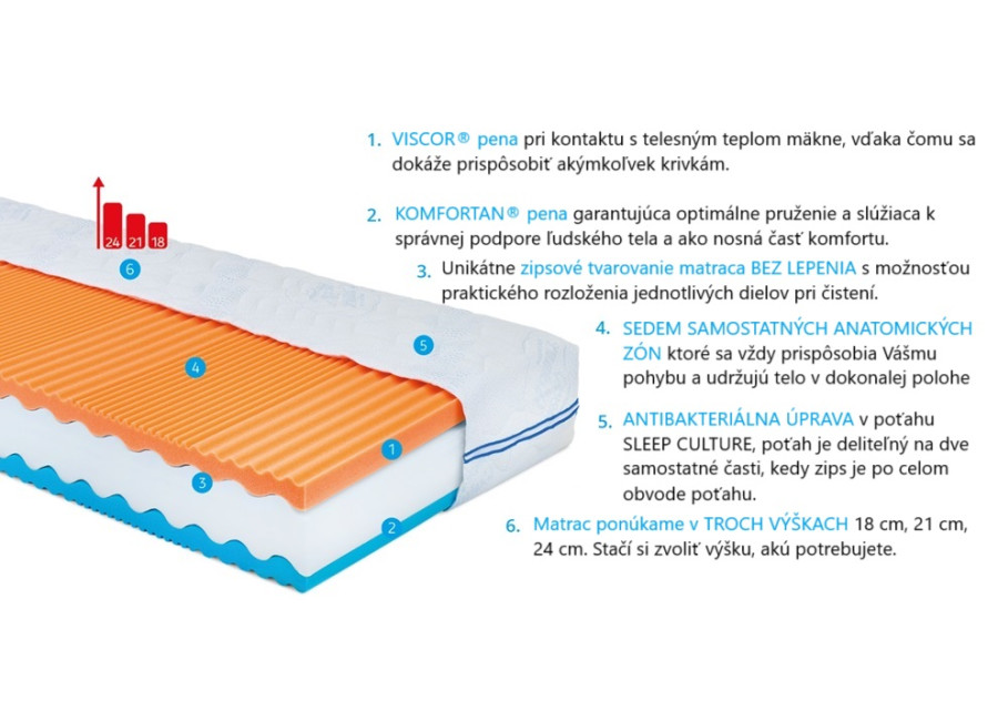 • luxusný poťah SLEEP CULTURE: tento poťah nielenže predchádza množeniu roztočov vďaka antibakteriálnej úprave, ale tiež ponúka príjemnú jemnosť na dotyk a elegantný dizajn.