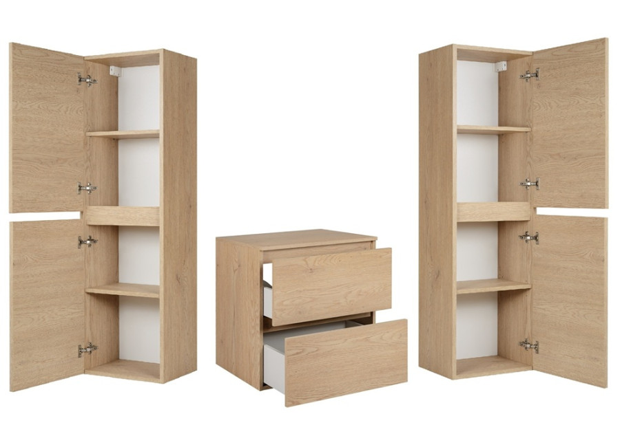 Dizajn kúpeľňovej zostavy SIMPLE Z02 je inšpirovaný najnovšími trendmi moderného interiérového dizajnu. Vyrobená je z vysoko kvalitnej laminovanej drevotriesky o hrúbke 16 mm. Farebný odtieň dub svetlý jej dodáva eleganciu, zatiaľ čo vnútorné povrchy zásuviek v decentnej svetlosivej farbe pridávajú zaujímavý kontrast.