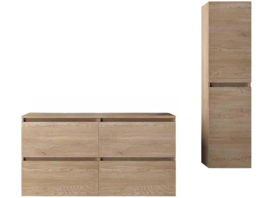 Hlavnou skrinkou celej zostavy je 120 cm závesná skrinka pod umývadlo (zložená z dvoch 60cm skriniek), vybavená štyrmi priestrannými zásuvkami so systémom Soft Close. Tento mechanizmus zabezpečuje tiché a plynulé zatváranie, vďaka čomu nábytok nielenže ponúka vyšší komfort pri používaní, ale aj dlhšie vydrží. Minimalistický vzhľad bez úchytiek s hladkými čielkami podčiarkuje moderný charakter. Zadná strana skrinky je navrhnutá bez sololitu, čo výrazne uľahčuje inštaláciu sifónu. Ku skrinke je potrebné zakúpiť plochý sifón a umývadlo, ktoré nájdete v našej ponuke.