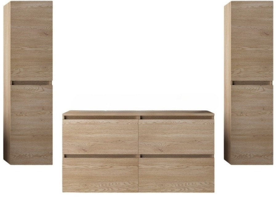 Hlavnou skrinkou celej zostavy je 120 cm závesná skrinka pod umývadlo (zložená z dvoch 60cm skriniek), vybavená štyrmi priestrannými zásuvkami so systémom Soft Close. Tento mechanizmus zabezpečuje tiché a plynulé zatváranie, vďaka čomu nábytok nielenže ponúka vyšší komfort pri používaní, ale aj dlhšie vydrží. Minimalistický vzhľad bez úchytiek s hladkými čielkami podčiarkuje moderný charakter. Zadná strana skrinky je navrhnutá bez sololitu, čo výrazne uľahčuje inštaláciu sifónu. Ku skrinke je potrebné zakúpiť plochý sifón a umývadlo, ktoré nájdete v našej ponuke.