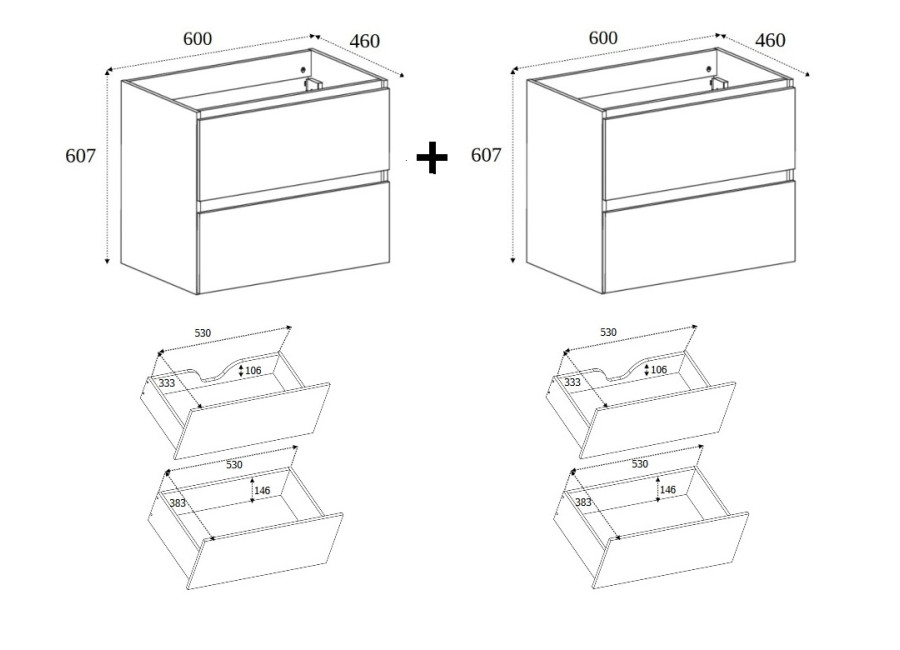 - 2 ks závesnej skrinky pod umývadlo so šírkou 60 cm (v/š/h: 60,7 x 60 x 46 cm),