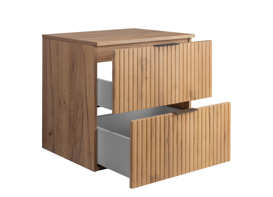 Hľadáte štýlový kúpeľňový nábytok, ktorý elegantne zapadne do Vášho interiéru? Zoznámte sa so závesnou skrinkou pod umývadlo FLOW C60DC vo farebnom prevedení dub craft zlatý. Skrinka je vyrobená z odolnej laminovanej drevotriesky s hrúbkou 16 mm, dvierka z vysoko kvalitného MDF materiálu zaručujú nielen dlhú životnosť, ale aj atraktívny vzhľad, ktorý upúta na prvý pohľad. Špeciálne navrhnuté drážkované zásuvky s technológiou Soft Close sa postarajú o komfort pri každodennom používaní a zabezpečia tiché a hladké uzatváranie. Na výber máte dve elegantné úchytky – čiernu a zlatú, ktoré si môžete pri montáži zvoliť podľa štýlu Vašej kúpeľne.