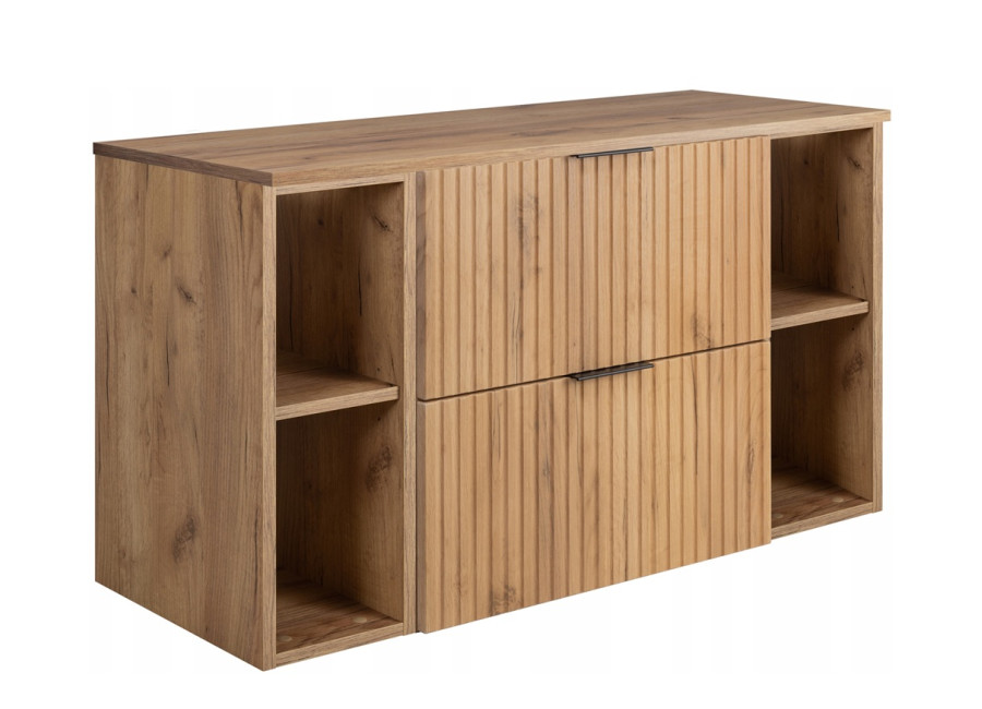 Korpus je vyrobený z laminovanej drevotriesky s ABS hranami, čielka zásuviek sú z MDF materiálu. Farebné prevedenie dub craft zlatý dodáva skrinke elegantný a luxusný nádych. Vnútorné časti zásuviek sú v neutrálnej svetlosivej farbe. Skrinka je určená na zavesenie na stenu, čo uľahčuje upratovanie podlahy a pôsobí odľahčeným dojmom. Súčasťou balenia sú dve sady úchytiek – v čiernej a zlatej farbe – môžete si tak vybrať variant, ktorý lepšie zapadne do Vášho konceptu kúpeľne. Moderne drážkované čielka zásuviek dotvárajú celkový dizajn a podčiarkujú moderný charakter skrinky.