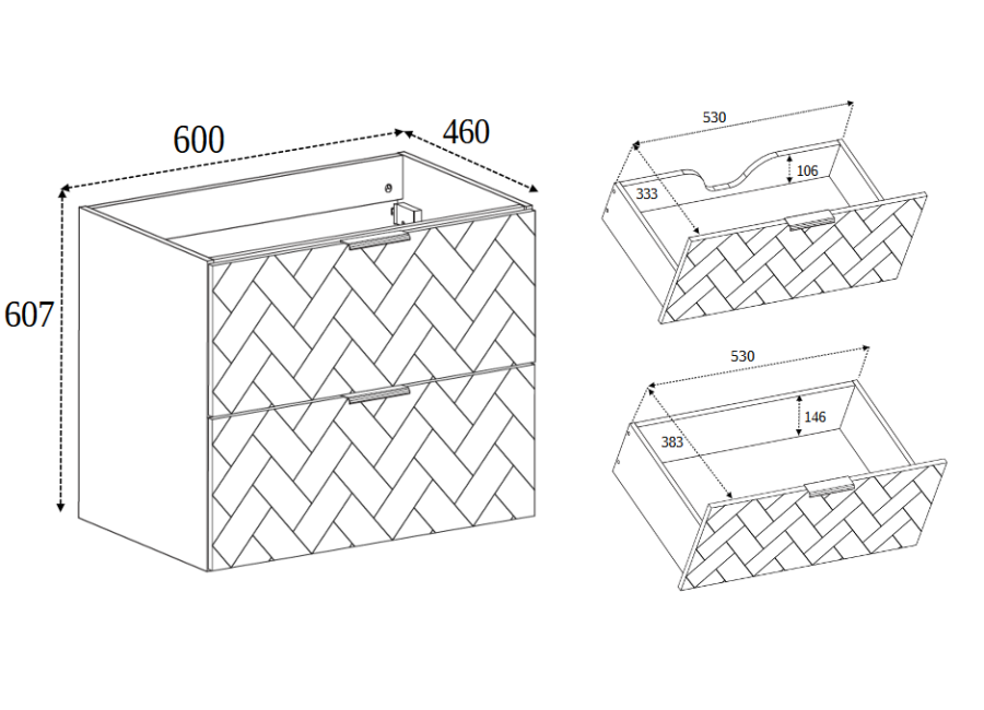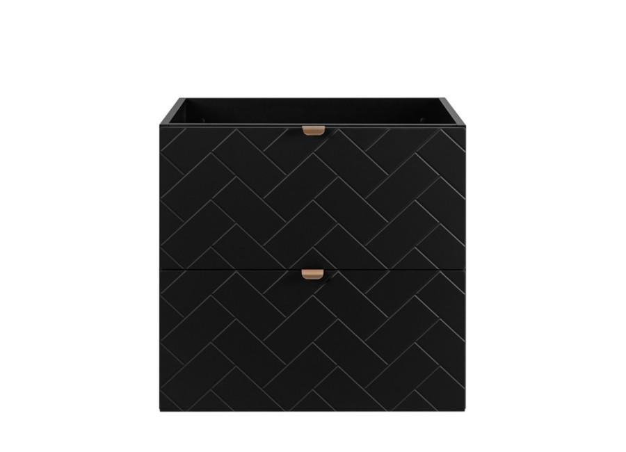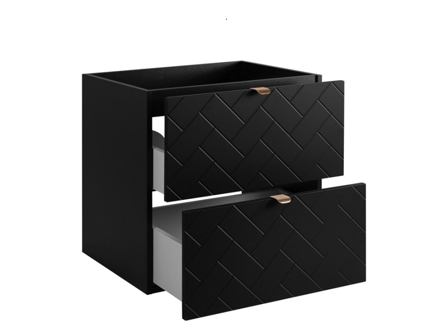 Osviežte svoju kúpeľňu moderným dizajnom s elegantnou závesnou skrinkou pod umývadlo TREND B60DB v štýlovej čierno-dubovej farebnej kombinácii. So šírkou 60 cm je ideálna pre menšie kúpeľne, pričom odolná laminovaná drevotrieska s ABS hranami zaručuje vysokú životnosť. Predné časti zásuviek, vyrobené z kvalitného MDF materiálu, zaujmú elegantným vzorom a technológia Soft Close zabezpečuje tiché a hladké zatváranie zásuviek. Súčasťou balenia sú tri rôzne sady úchytiek v čiernej, striebornej a zlatej farbe, vďaka ktorým si môžete skrinku prispôsobiť podľa vlastného vkusu. Ku skrinke je potrebné dokúpiť plochý sifón a vrchné umývadlo.